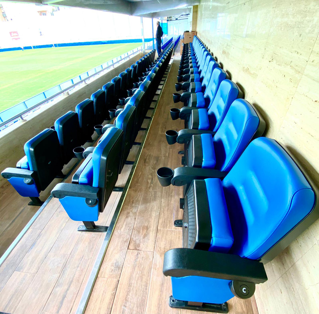 Installation von Sitzen von Ezcaray Seating in den Stadionlogen, Modell: Granada C.